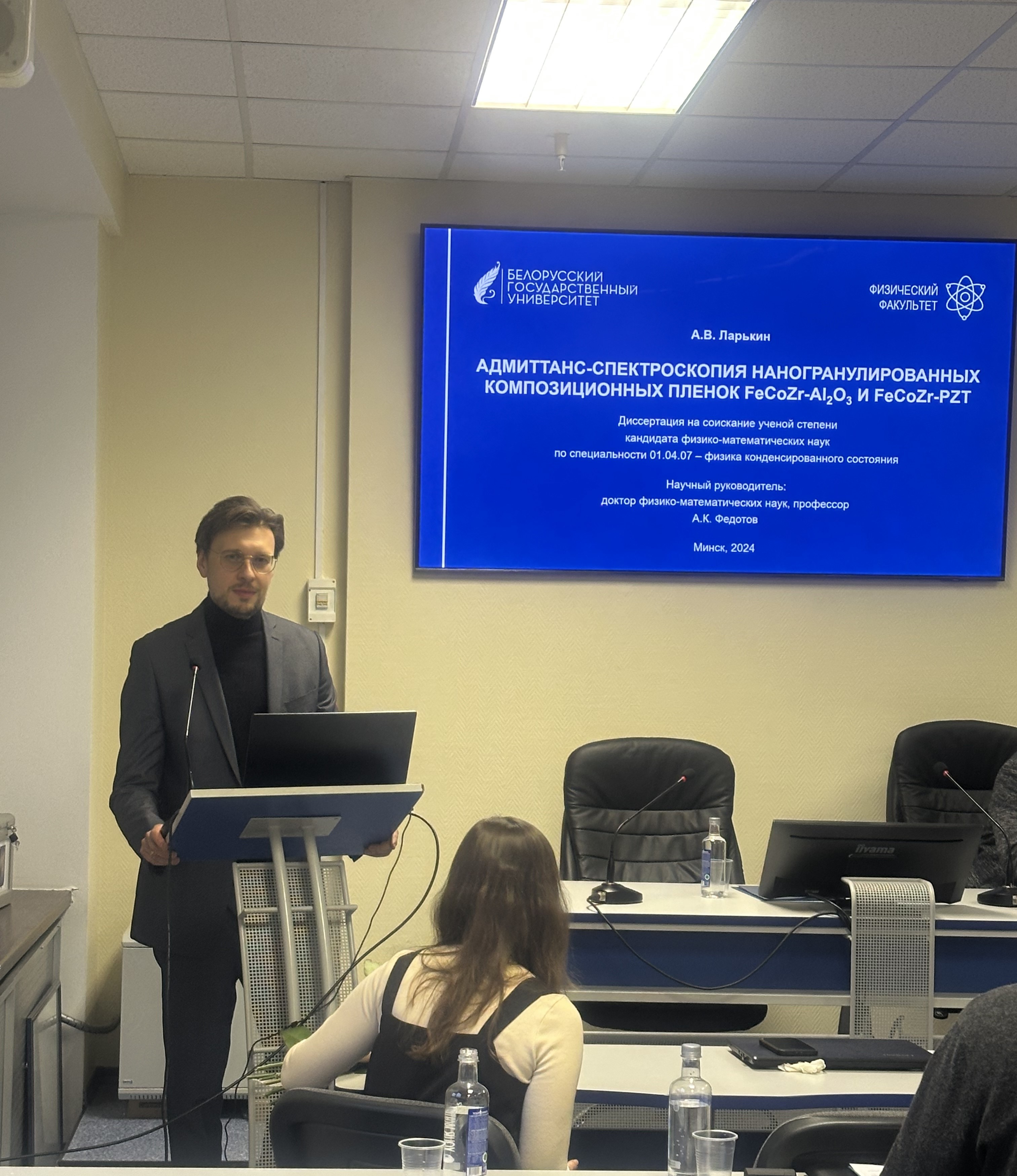 Высшей аттестационной комиссией Республики Беларусь подведены итоги ежегодного конкурса на лучшую докторскую и кандидатскую диссертации за 2025 год. По его результатам доцент кафедры физики твердого тела и нанотехнологий, кандидат физико-математических наук Ларькин Андрей Викторович признан победителем конкурса на лучшую кандидатскую диссертацию с вручением диплома лауреата конкурса в номинации «естественные науки» (диссертация «Адмиттанс-спектроскопия наногранулированных композиционных пленок FeCoZr-Al2O3 и FeCoZr-PZT»).