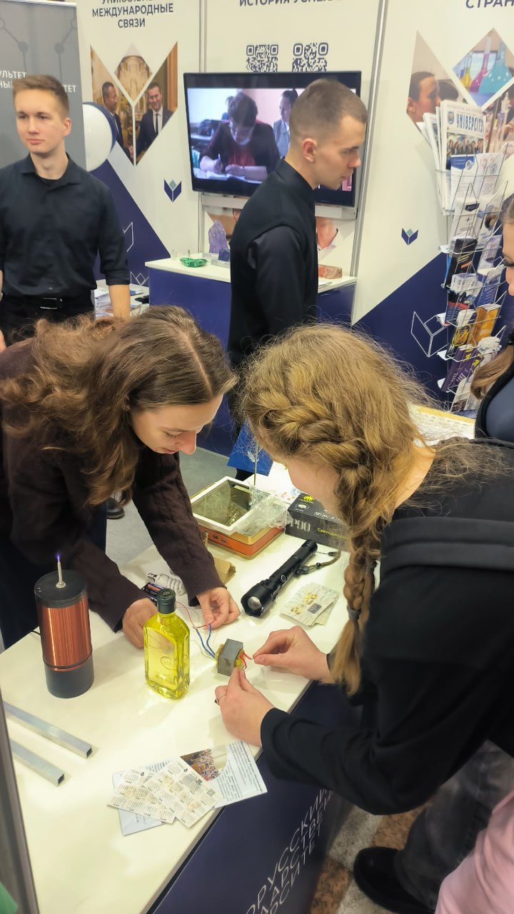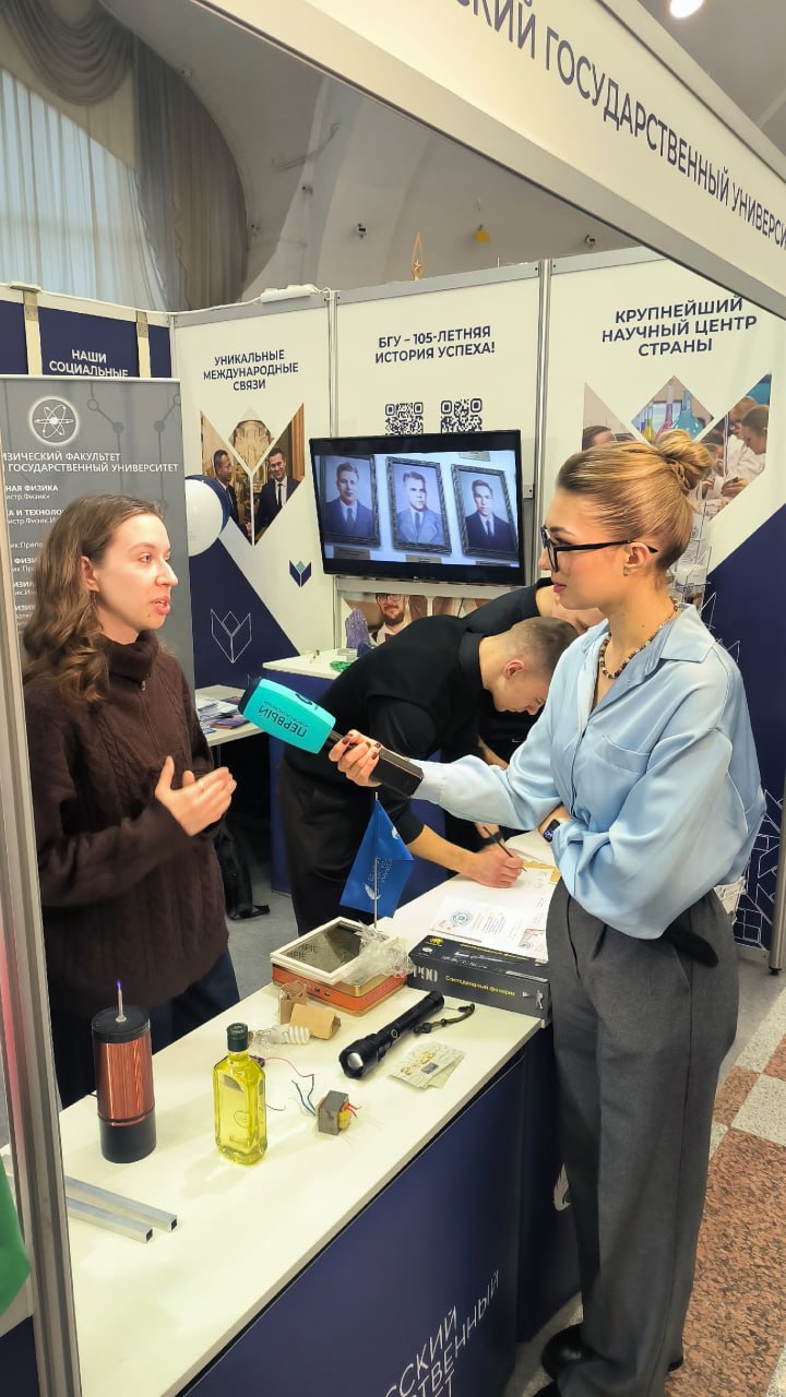 В дни выставки студенты физического факультета активно общались с будущими абитуриентами, рассказывали подробно о всех специальностях, правилах приёма и возможностях обучения на нашем факультете. Провели мастер-класс по электричеству и оптике, продемонстрировав захватывающие эксперименты, которые вызвали живой интерес у посетителей.