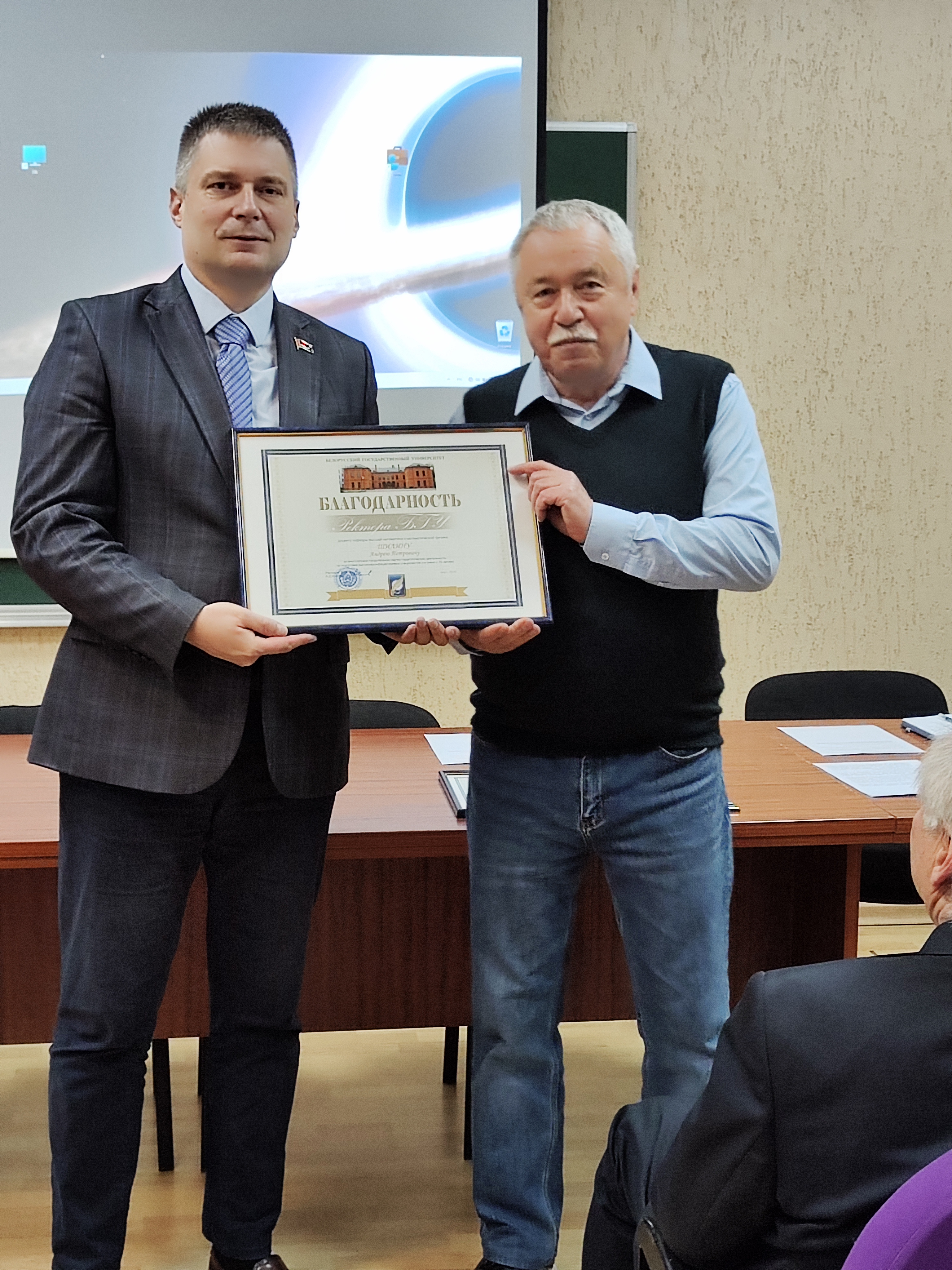 Благодарность ректора БГУ объявлена доценту кафедры высшей математики и математической физики Шилину Андрею Петровичу за многолетнюю научно-педагогическую деятельность по подготовке высококвалифицированных специалистов и в связи с 70-летием.
