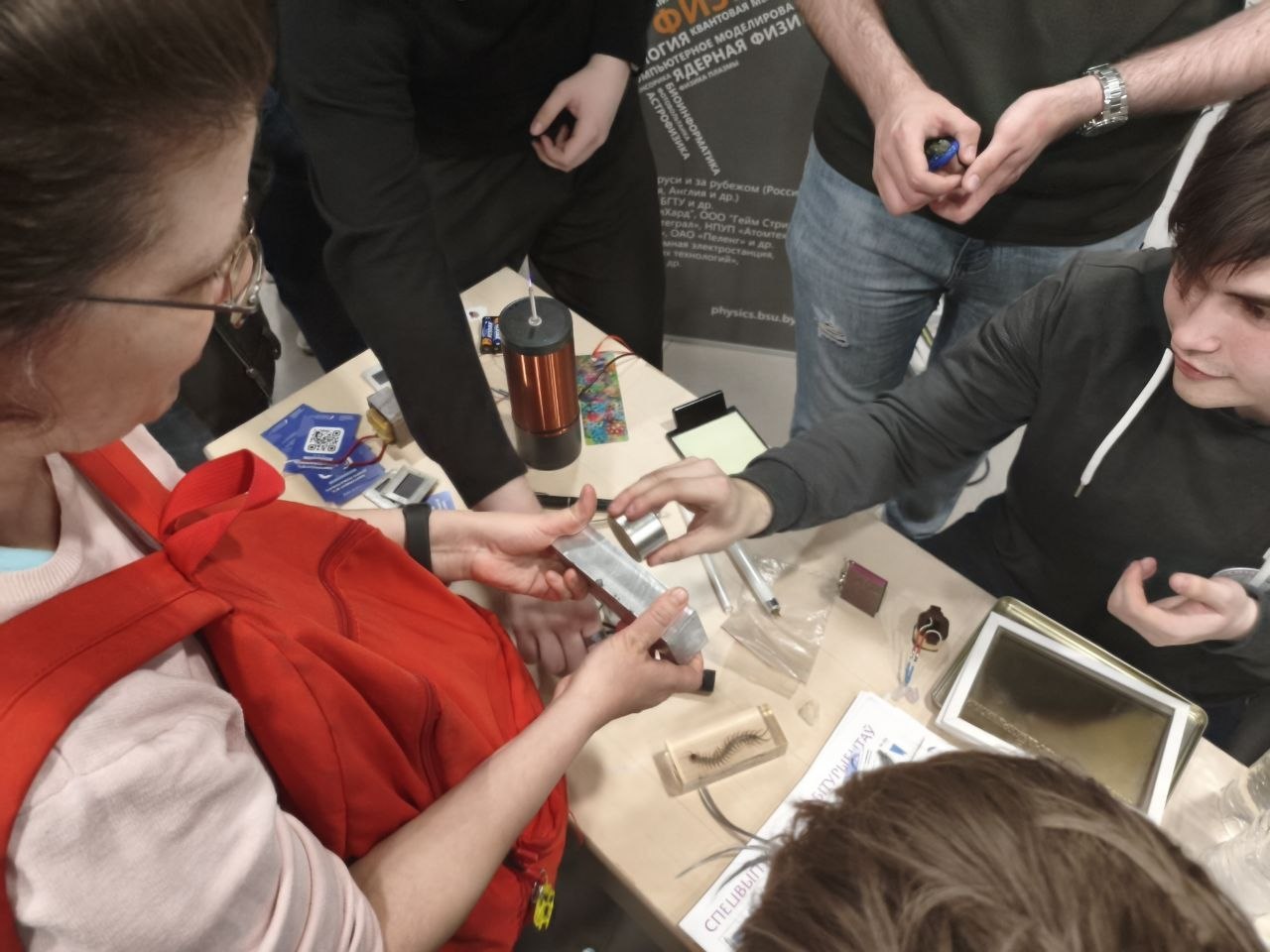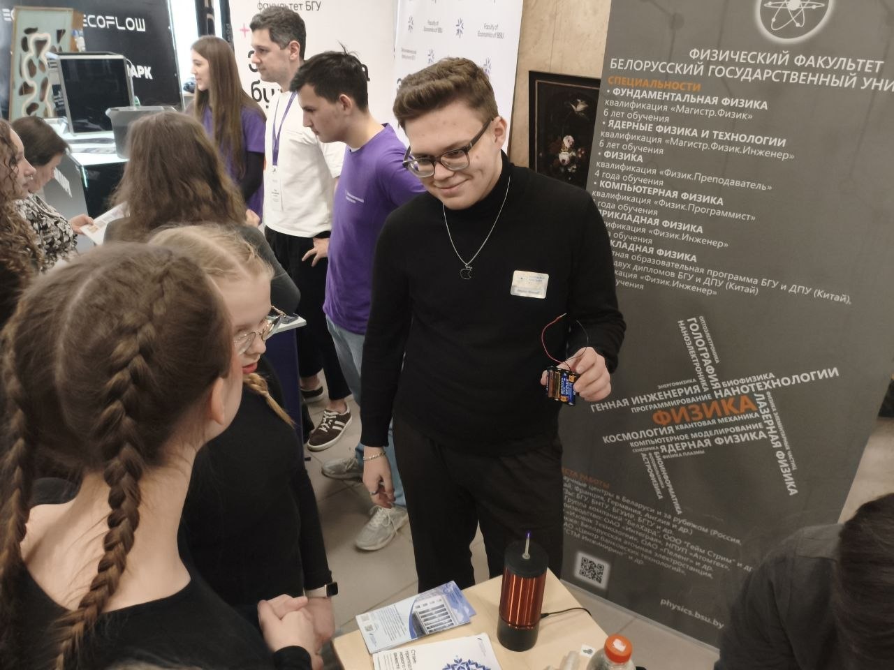 24 апреля студенты физического факультета приняли участие в ежегодной культурно-просветительской акции «Библионочь-2026». В этом году площадкой её проведения для БГУ было выбрано государственное учреждение «Национальная библиотека Беларуси». Ведущий вуз Беларуси представил свою экспозицию в рамках образовательной зоны «Молодежь. Инновации. Будущее».