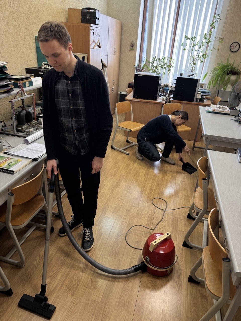 Cотрудники и студенты физического факультета активно приняли участие в Республиканском субботнике, проводя уборку не только на рабочих местах, но и в подсобных помещениях, учебных лабораториях, благодаря чему в корпусе в целом наведен порядок и чистота.